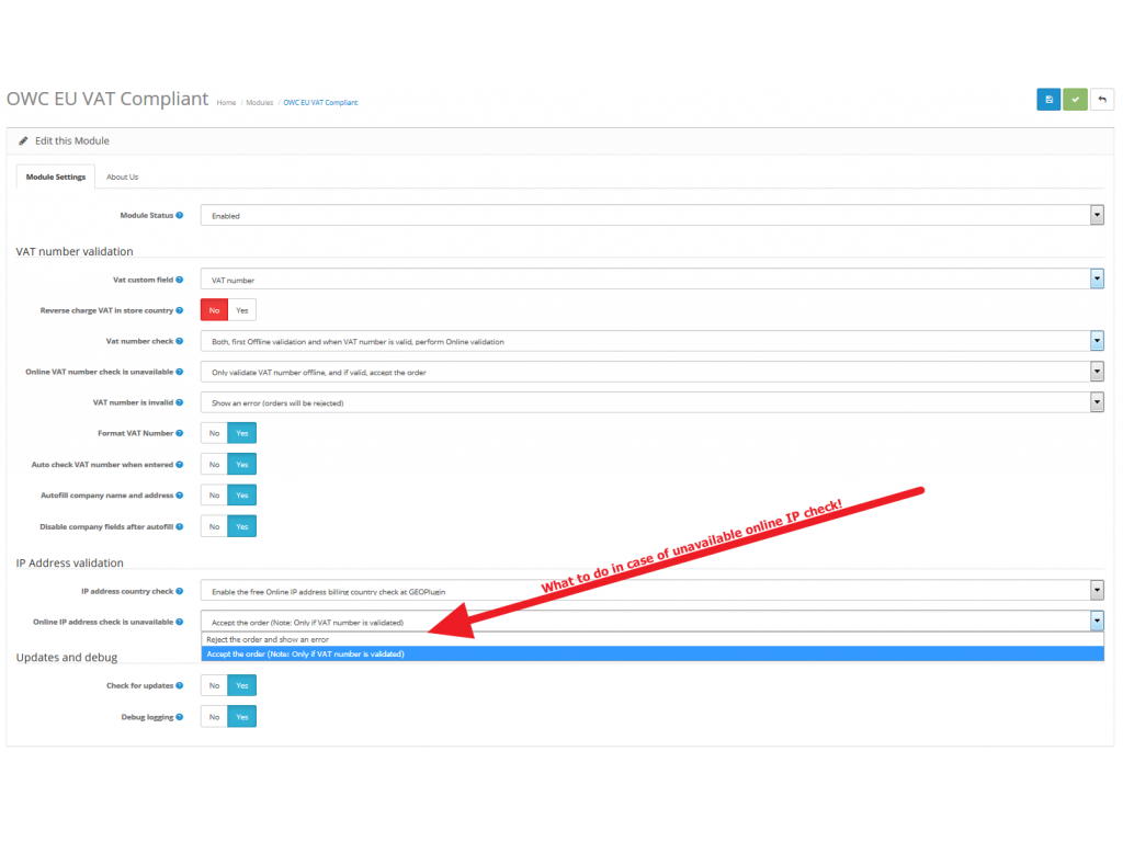 - IP address country check service failed: Setting how to handle when the Online IP address country service is unavailable, 1: Reject the order and show an error, 2 Accept the order (Note: Only if VAT number is validated).